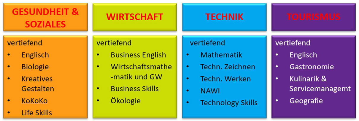 Nach einer Orientierungsphase in der 3. Klasse tauchen die Schüler*innen in der 4. Klasse bereits in sechs Wochenstunden den gewählten Fachbereich ein. Bei der Auswahl der Module haben wir ein besonderes Augenmerk darauf gelegt, Dass wir Module anbieten, in denen es auch in Zukunft attraktive Berufschancen gibt.