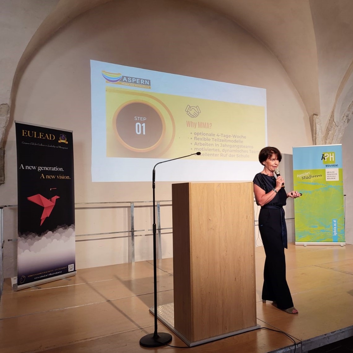 "Strukturiertes Onboarding als Beitrag zur Förderung von Lehrer*innengesundheit am Beispiel der Modularen Mittelstufe Aspern": Das war das Thema der Keynote unserer Direktorin Doris Pfingstner bei der EULEAD Summerschool 2024 im Stift Lilienfeld.