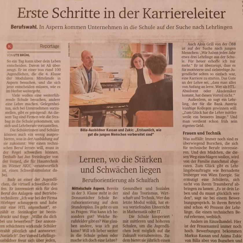 Der KURIER berichtet über unseren MMA Business Day, bei dem Schüler*innen, die im 9. oder 10. Schuljahr sind, namhafte Top-Unternehmen treffen können, die auf der Suche nach gut ausgebildeten Lehrlingen sind.