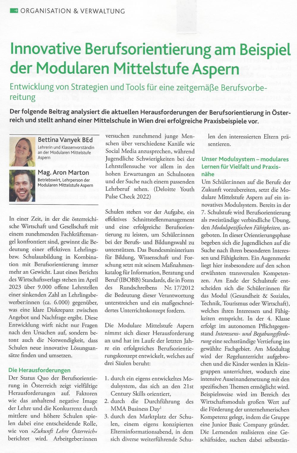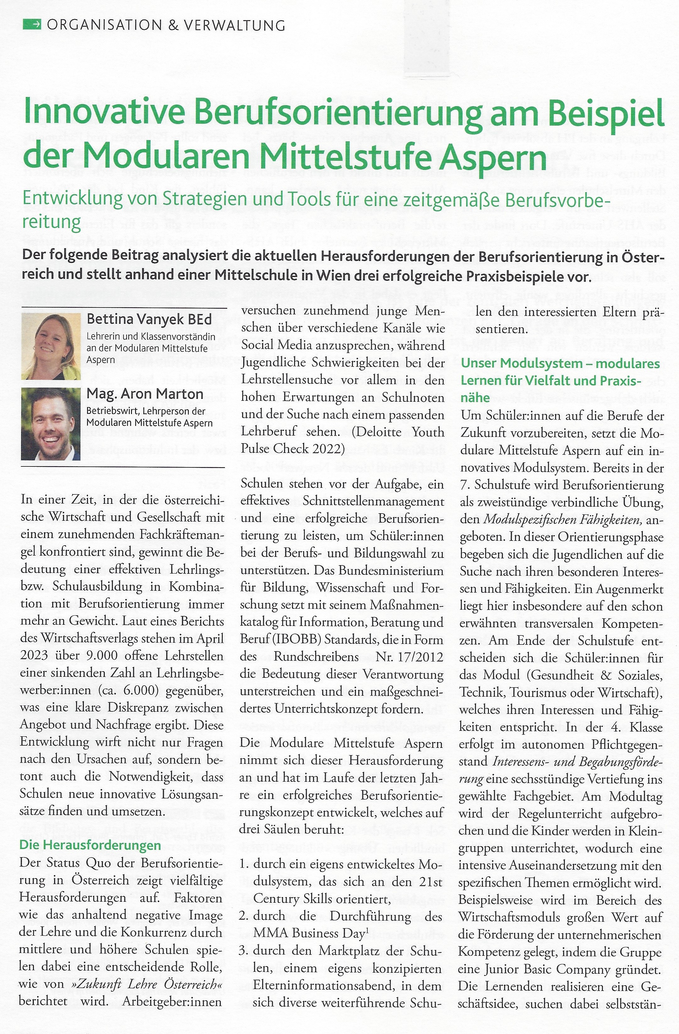 Zwei unserer Berufsorientungsprofis, Frau Bettina Vanyek, BEd, und Herr Mag. Aron Marton analysieren im renommierten Fachmagazin Schulverwaltung aktuell die aktuellen Herausforderungen der Berufsorientierung in Österreich und stellen anhand der Modularen Mittelstufe Aspern drei erfolgreiche Praxisbeispiele vor:
