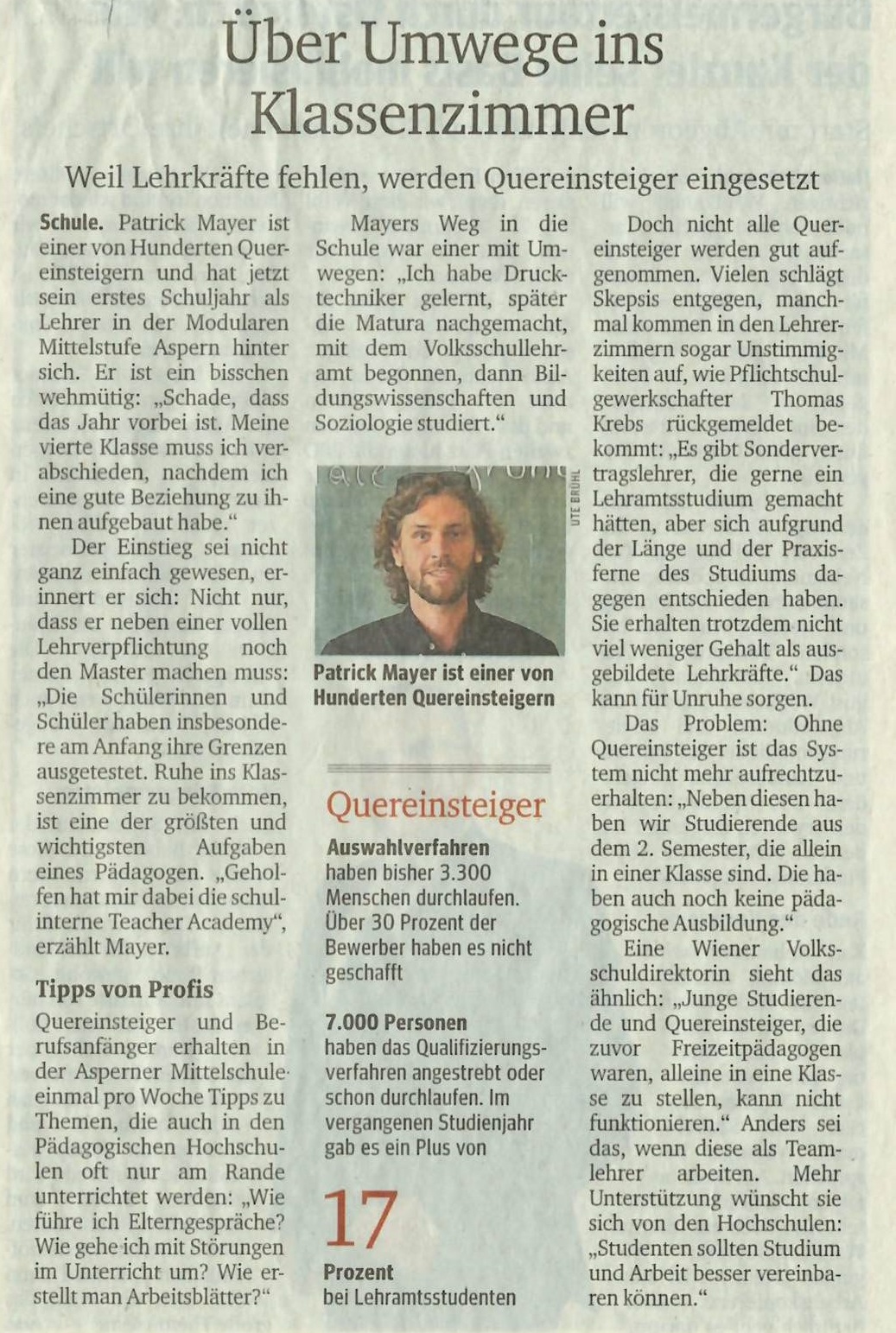 Der KURIER vom 23.06.2024 berichtete über die Erfahrungen mit Quereinsteiger*innen in der Schule.