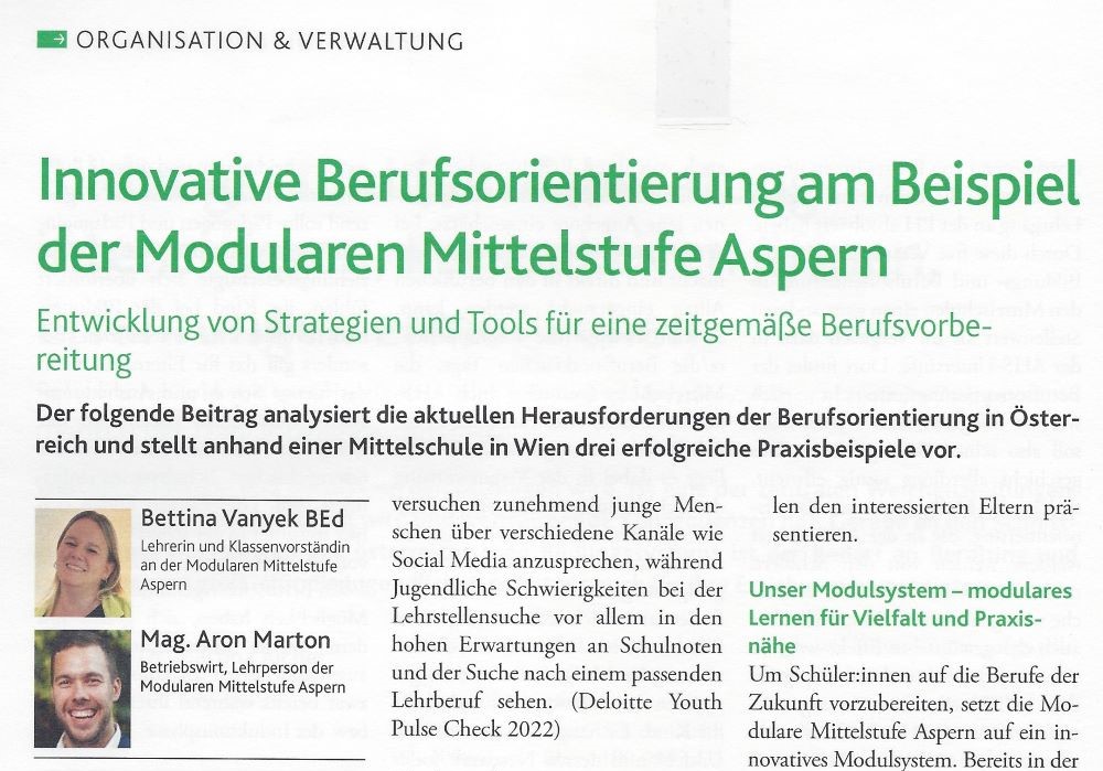 Zwei unserer Berufsorientungsprofis, Frau Bettina Vanyek, BEd, und Herr Mag. Aron Marton analysieren im renommierten Fachmagazin Schulverwaltung aktuell die aktuellen Herausforderungen der Berufsorientierung in Österreich und stellen anhand der Modularen Mittelstufe Aspern drei erfolgreiche Praxisbeispiele vor: